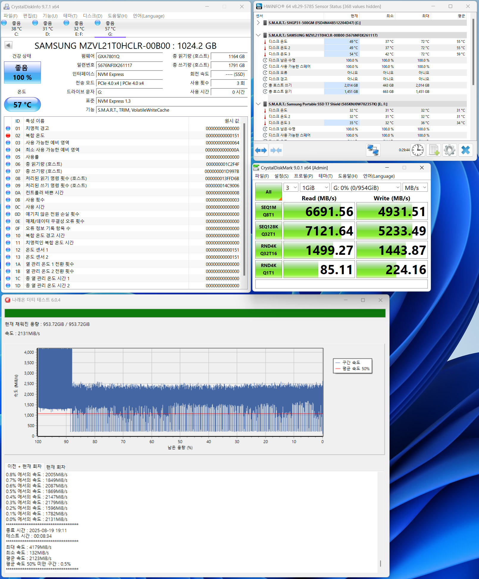 최대 속도 : 4,179 MiB/s 최소 속도 : 132 MiB/s (최대 속도 대비 -96.85%) 평균 속도 : 2,123 MiB/s (최대 속도 대비 - 49.20%) 평균 속도 50% 미만 구간 : 0.5% 1TB 기준 테스트 시간 : 8분 34초 ------------------------------------------------------- 장점 : 가성비 좋음, 신뢰도 높은 브랜드, 균형적인 속도와 발열, 불량이 적음, 속도 유지 우수. 단점 : AS가 1~2 년으로 매우 짧음, 노트북 적출 상품.
