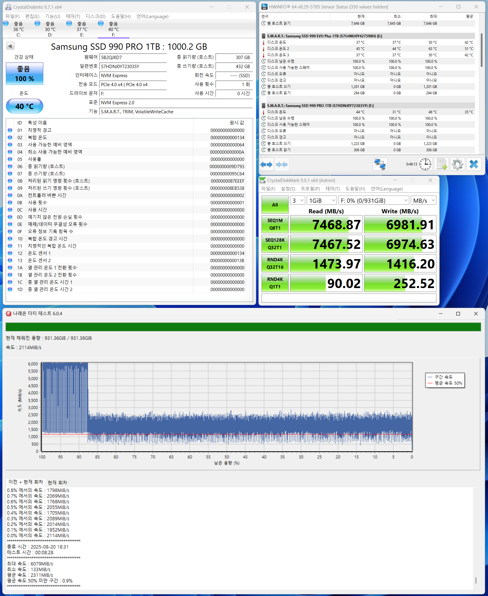 최대 속도 : 6,079 MiB/s 최소 속도 : 133 MiB/s (최대 속도 대비 -97.82%) 평균 속도 : 2,311 MiB/s (최대 속도 대비 - 61.99%) 평균 속도 50% 미만 구간 : 0.9% 1TB 기준 테스트 시간 : 8분 28초 ------------------------------------------------------- 장점 : 신뢰도 높은 브랜드, 균형적인 속도와 발열, 불량이 적음, 신속한 A/S, 속도 유지 우수. 단점 : PM9A1에 비해 떨어지는 가성비.