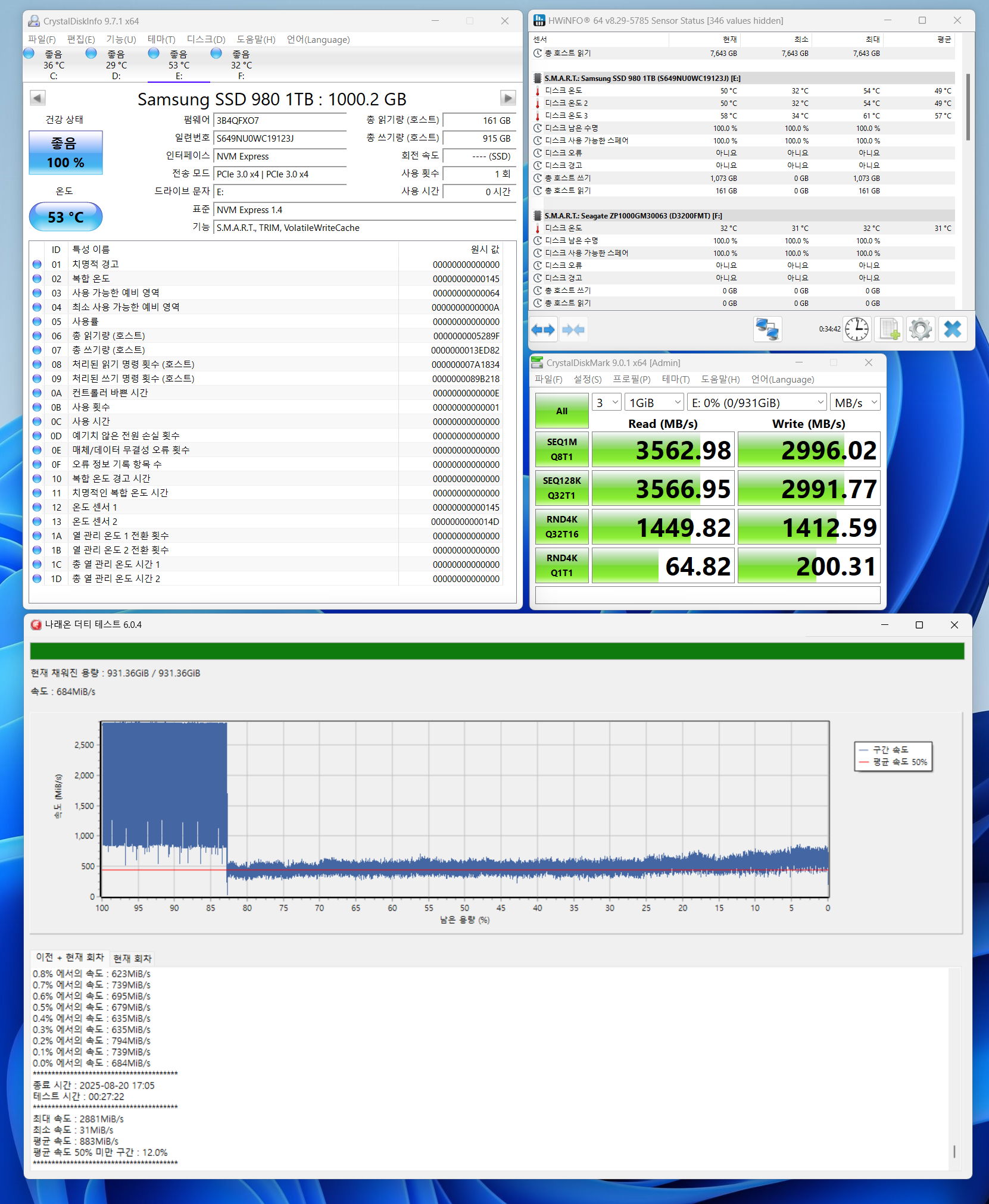 최대 속도 : 2,881 MiB/s 최소 속도 : 31 MiB/s (최대 속도 대비 -98.93%) 평균 속도 : 883 MiB/s (최대 속도 대비 -69.36%) 평균 속도 50% 미만 구간 : 12.0% 1TB 기준 테스트 시간 : 27분 22초 ------------------------------------------------------- 장점 : 신뢰도 높은 브랜드, 불량이 적음, 신속한 A/S 단점 : 디램리스, 캐시 소진 이후 극심한 속도 저하, 복잡한 연산 작업은 비추. 사무용으로만 사용가능.