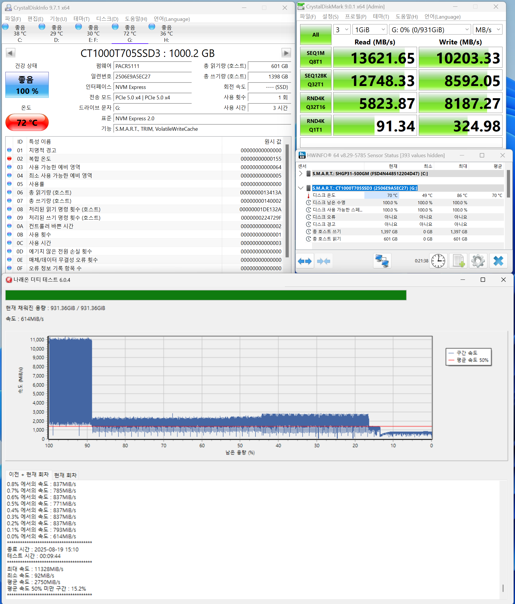 최대 속도 : 11,328 MiB/s 최소 속도 : 92 MiB/s (최대 속도 대비 -99.19%) 평균 속도 : 2,750 MiB/s (최대 속도 대비 -75.73%) 평균 속도 50% 미만 구간 : 15.2% 1TB 기준 테스트 시간 : 9분 44초 ------------------------------------------------------- 장점 : 최고 수준의 성능, 신뢰도 높은 브랜드, 미래 대비 투자 가치. 단점 : 높은 가격, 호환성, 높은 발열, 냉각 비용, 가격 변동성, 비용 대비 체감 성능의 한계, 최신 이슈 콘트롤러 (파이슨)