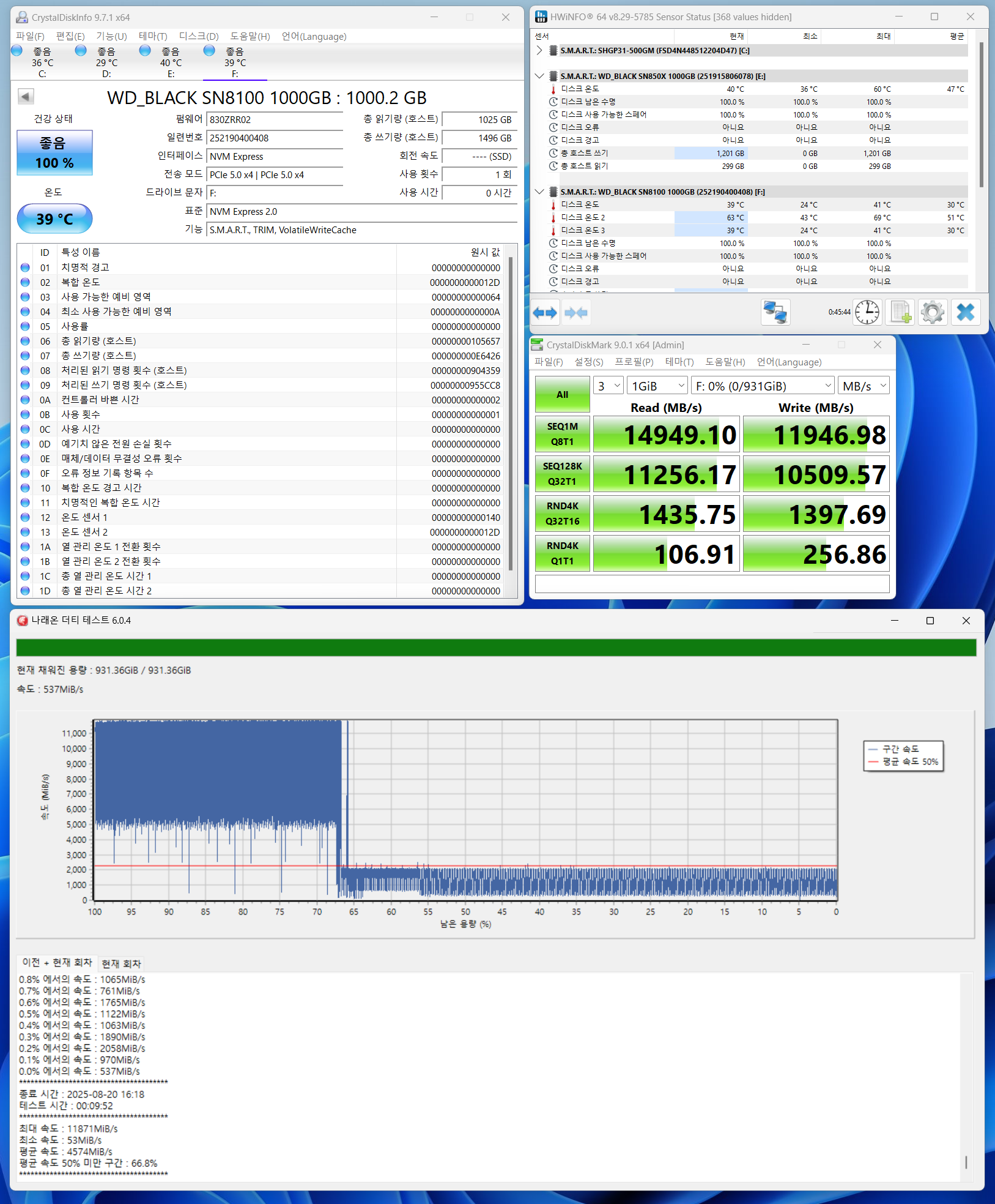 최대 속도 : 11,871 MiB/s 최소 속도 : 53 MiB/s (최대 속도 대비 -99.56%) 평균 속도 : 4,574 MiB/s (최대 속도 대비 -61.47%) 평균 속도 50% 미만 구간 : 66.8% 1TB 기준 테스트 시간 : 9분 52초 ------------------------------------------------------- 장점 : 최고 수준의 성능, 신뢰도 높은 브랜드, 미래 대비 투자 가치. 단점 : 높은 가격, 호환성, 높은 발열, 냉각 비용, 가격 변동성, 비용 대비 체감 성능의 한계.