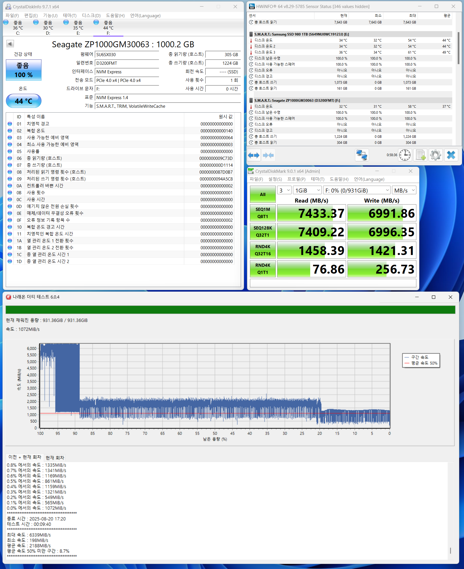 최대 속도 : 6,339 MiB/s 최소 속도 : 198 MiB/s (최대 속도 대비 -96.88%) 평균 속도 : 2,188 MiB/s (최대 속도 대비 - 65.49%) 평균 속도 50% 미만 구간 : 8.7% 1TB 기준 테스트 시간 : 9분 40초 ------------------------------------------------------- 장점 : 가성비 좋음, 신뢰도 높은 브랜드, 균형적인 속도와 발열, 신속한 A/S, 3년 데이터복구 서비스. 단점 : 최신 이슈가 있었던 파이슨 콘트롤러.