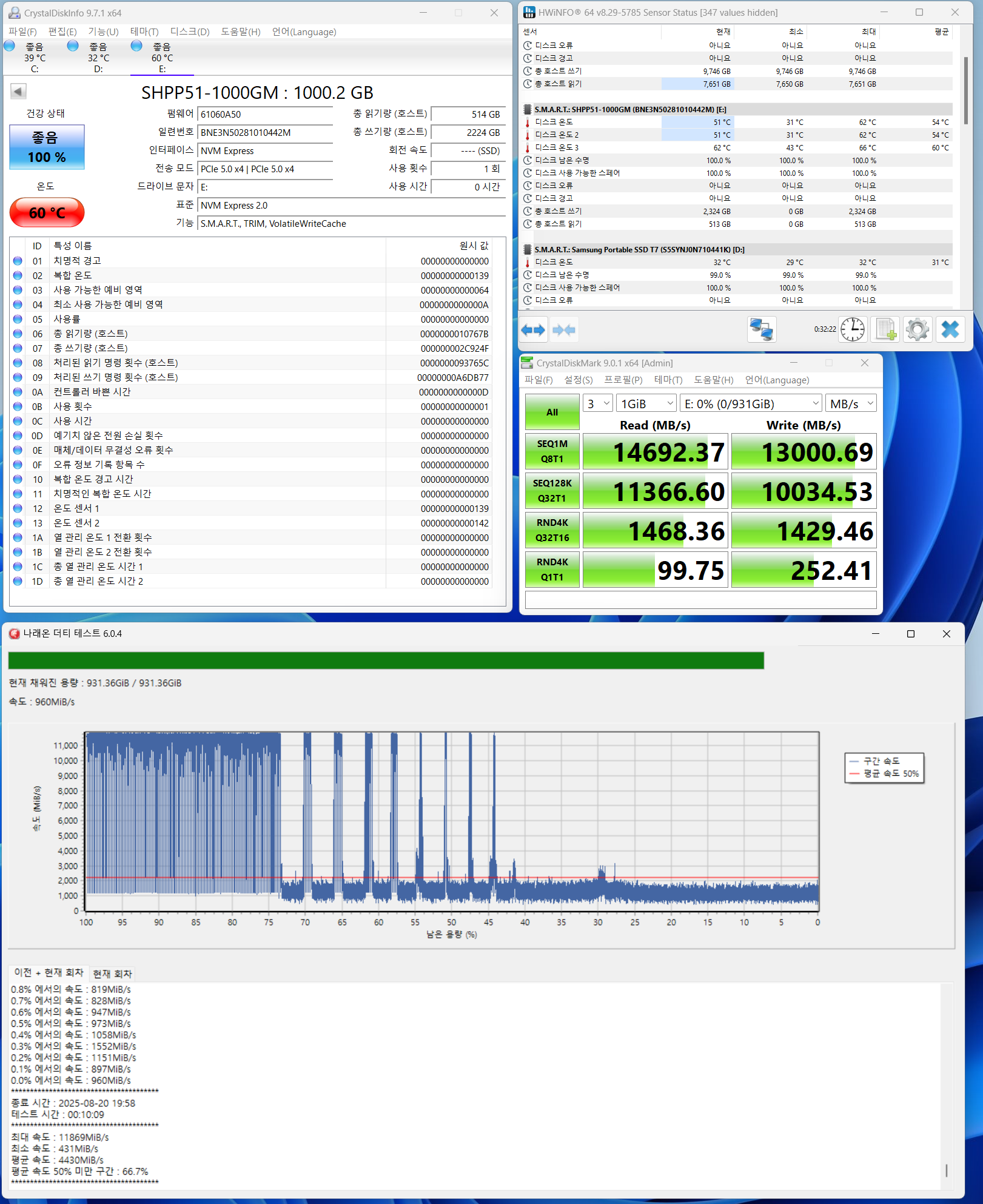 최대 속도 : 11,869 MiB/s 최소 속도 : 431 MiB/s (최대 속도 대비 -96.37%) 평균 속도 : 4,430 MiB/s (최대 속도 대비 - 62.68%) 평균 속도 50% 미만 구간 : 66.7% 1TB 기준 테스트 시간 : 10분 9초 ------------------------------------------------------- 장점 : 최고 수준의 성능, 신뢰도 높은 브랜드, 미래 대비 투자 가치. 단점 : 높은 가격, 호환성, 높은 발열, 냉각 비용, 가격 변동성, 비용 대비 체감 성능의 한계.