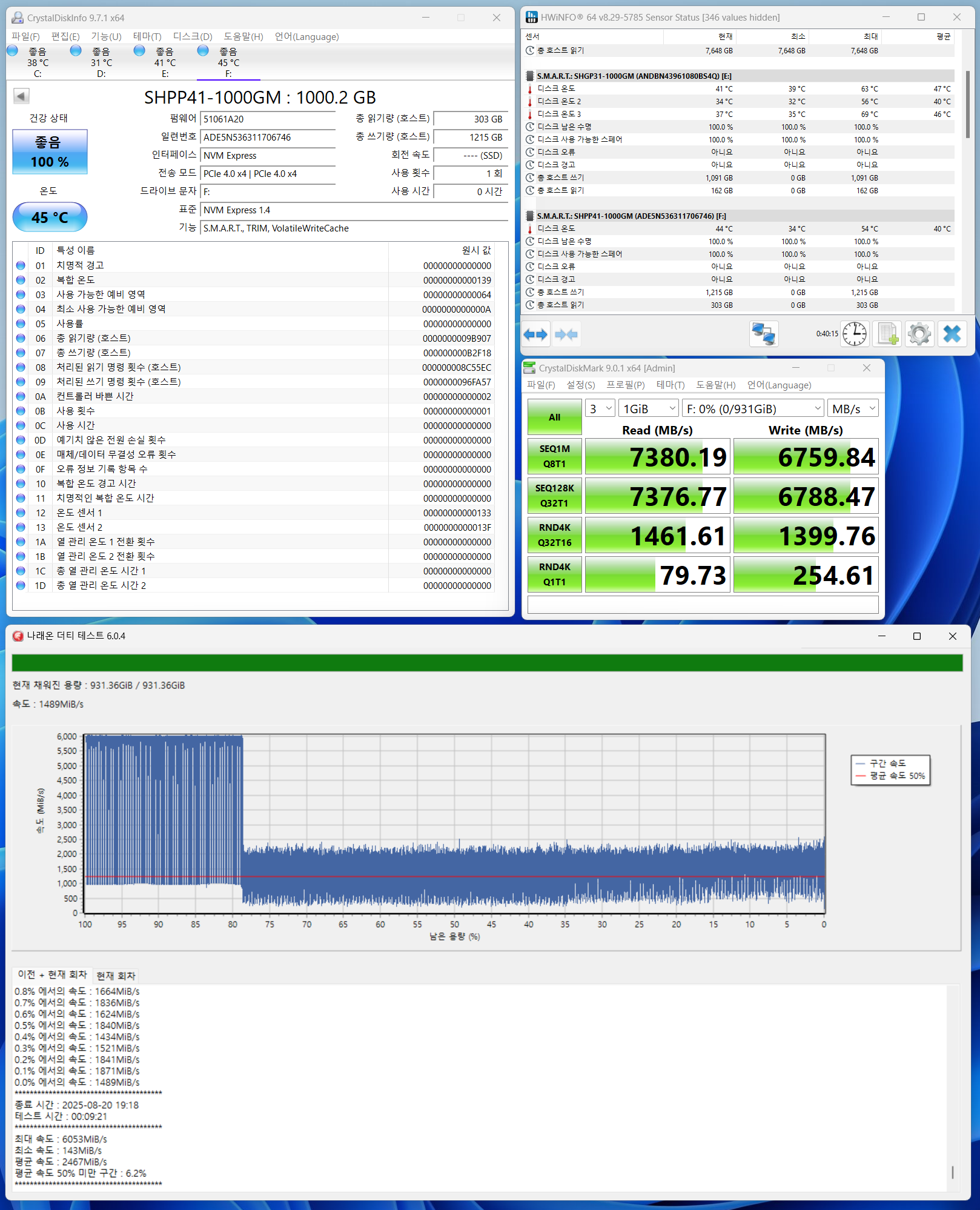 최대 속도 : 6,053 MiB/s 최소 속도 : 143 MiB/s (최대 속도 대비 -97.64%) 평균 속도 : 2,467 MiB/s (최대 속도 대비 - 59.25%) 평균 속도 50% 미만 구간 : 6.2% 1TB 기준 테스트 시간 : 9분 21초 ------------------------------------------------------- 장점 : 가성비 좋음, 신뢰도 높은 브랜드, 균형적인 속도와 발열, 불량이 적음. 단점 : 딱히 없음.