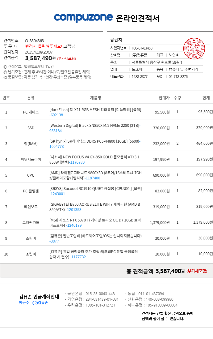 PC 구성 : 본체결제방식 : 현금(무통장입금)안녕하세요, 팜피씨샵입니다.