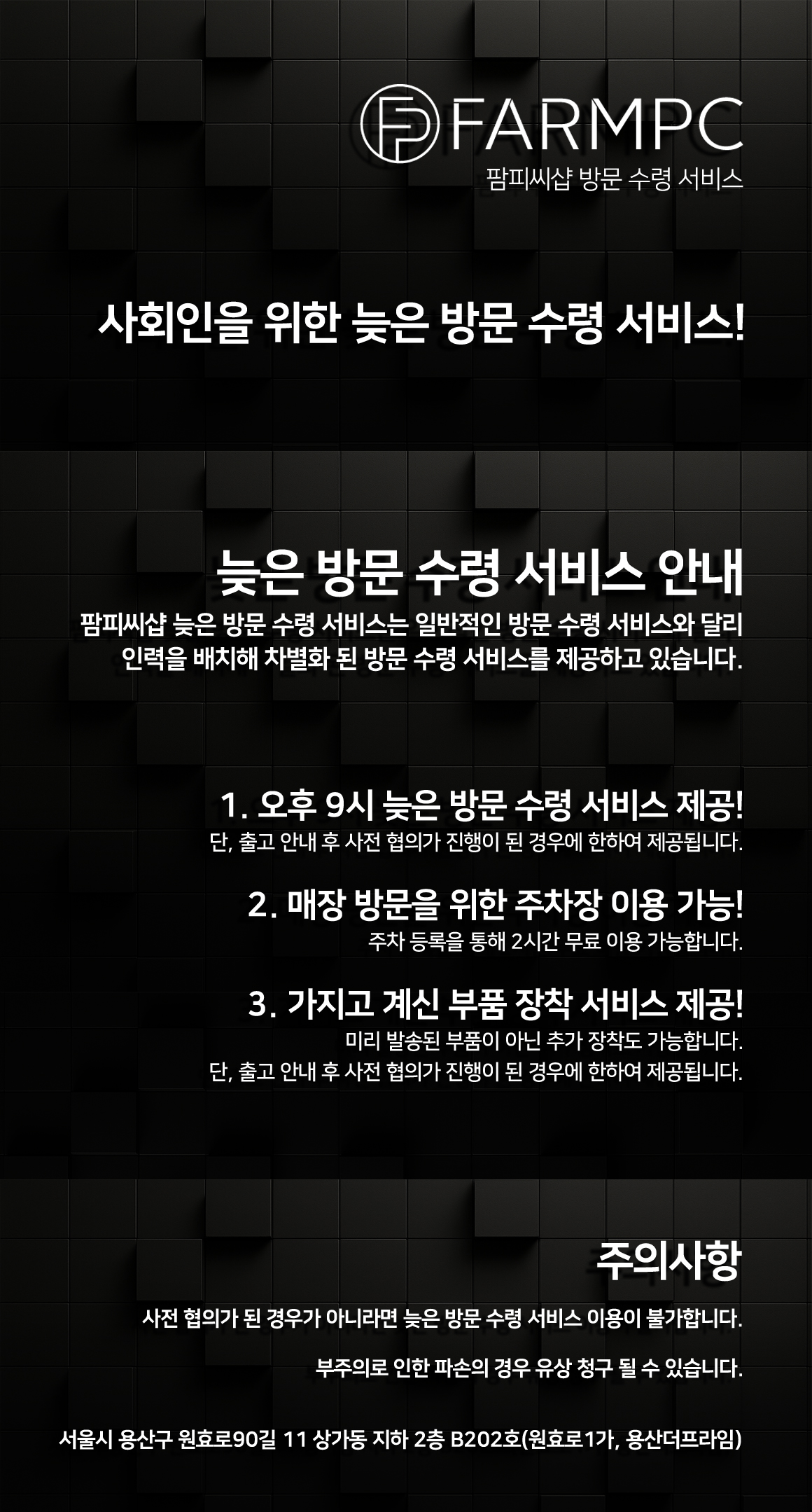 평일야간(밤10시), 주말(토,일요일) 예약제로 방문수령 및 퀵서비스(수도권) 운영합니다.